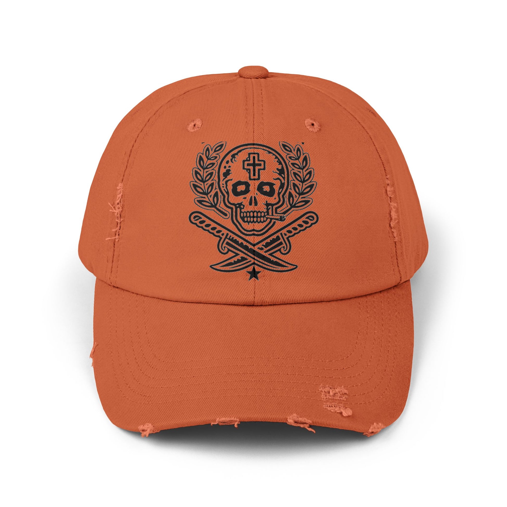 This distressed cotton cap wears like a story—soft, broken-in, and ready for afternoons on the road or late-night bonfires. A hand-drawn skull and crossed-swords emblem sits front-and-center, framed by laurel leaves for a rugged, slightly rebellious look that still reads timeless. The low-profile, unstructured crown and curved visor settle comfortably above the eyes, while intentional distressing and breathable eyelets give it a lived-in edge. The muted, natural tone pairs easily with worn denim, leather jackets, or a simple tee, adding quiet attitude without shouting. Expect small variations in distress and color; each hat arrives with its own unique character.