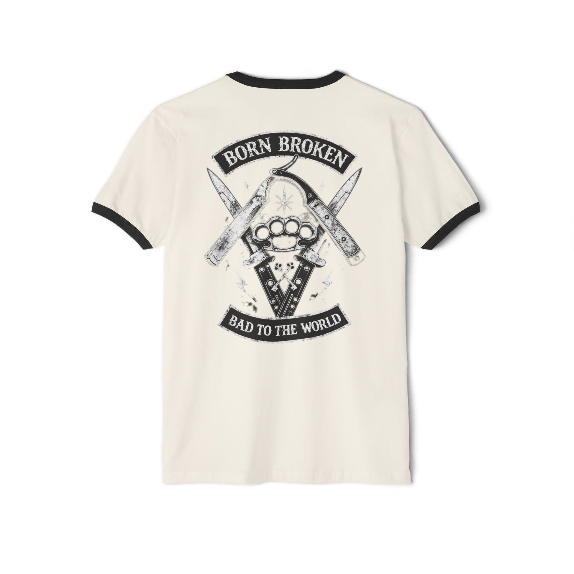 Lightweight ringer tee with a vintage, rebellious edge. The soft, combed cotton feels broken-in from the first wear while the contrasting collar and sleeve cuffs give it a retro silhouette. Front chest and full-back artwork show a gritty emblem—knuckled brass, crossed knives and distressed banners reading “Born Broken / Bad to the World”—that reads like a badge of lived experience. Wear it on weekend rides, late-night meetups, or while tinkering in the garage; it layers easily under jackets and keeps its shape thanks to side seams and a classic cut. The tear-away label keeps the neck clean and comfortable so the shirt feels like it was made for you, not a mannequin.