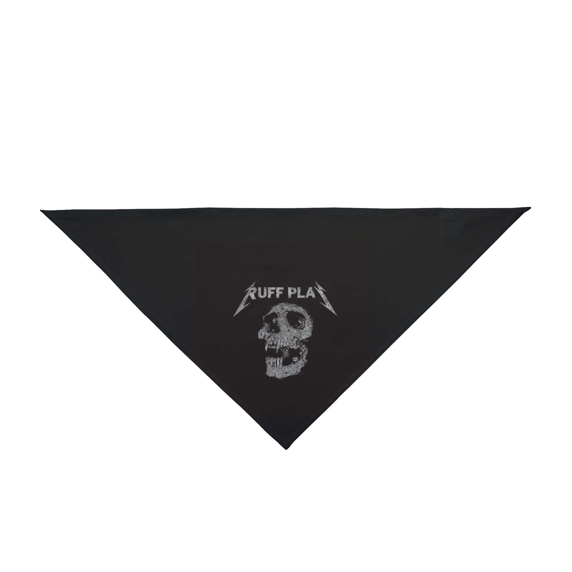 Give your pup a rocker-ready look with this lightweight triangular bandana. The black, all-over print features a distressed skull graphic and bold lettering that reads “RUFF PLAY,” giving off gritty, vintage concert-poster energy. It ties easily around collars or necks and keeps its shape thanks to hemmed edges and a durable polyester weave. Wear it on long walks, at backyard barbecues, or during a weekend jam session to let your dog share a little edge with you.