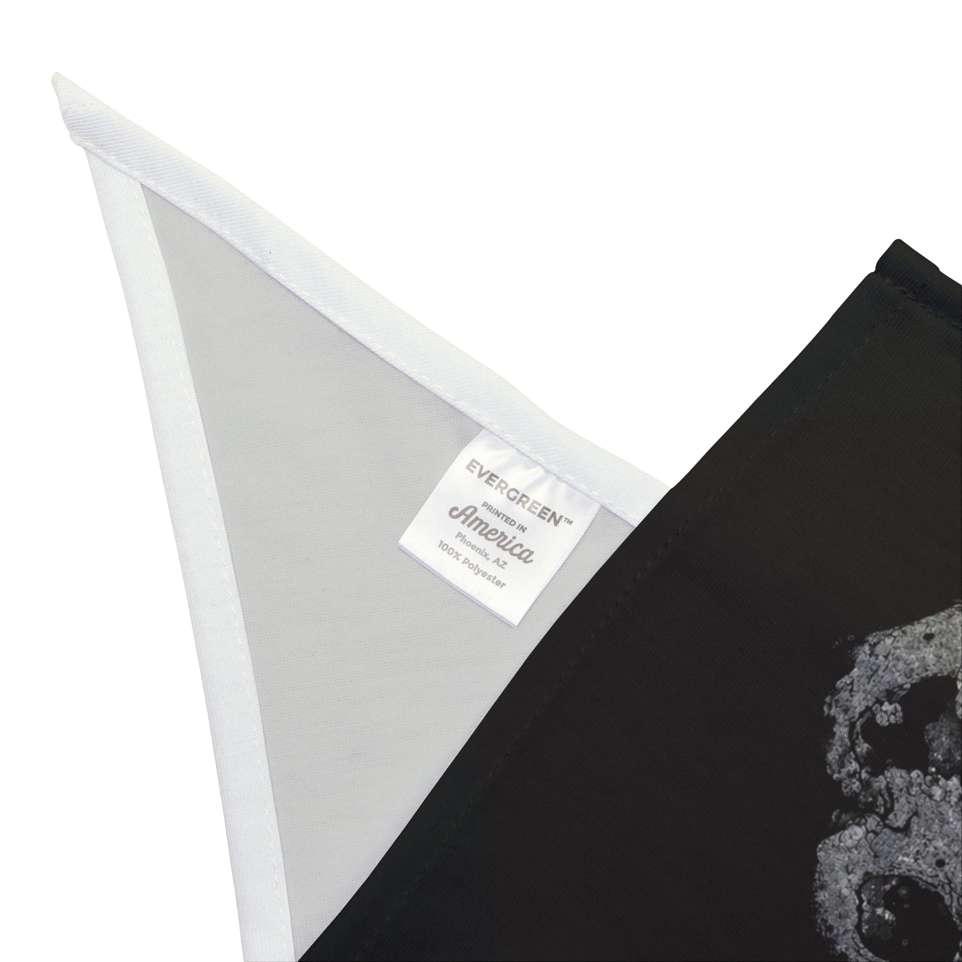 - All-over, one-sided print with distressed skull and lettering