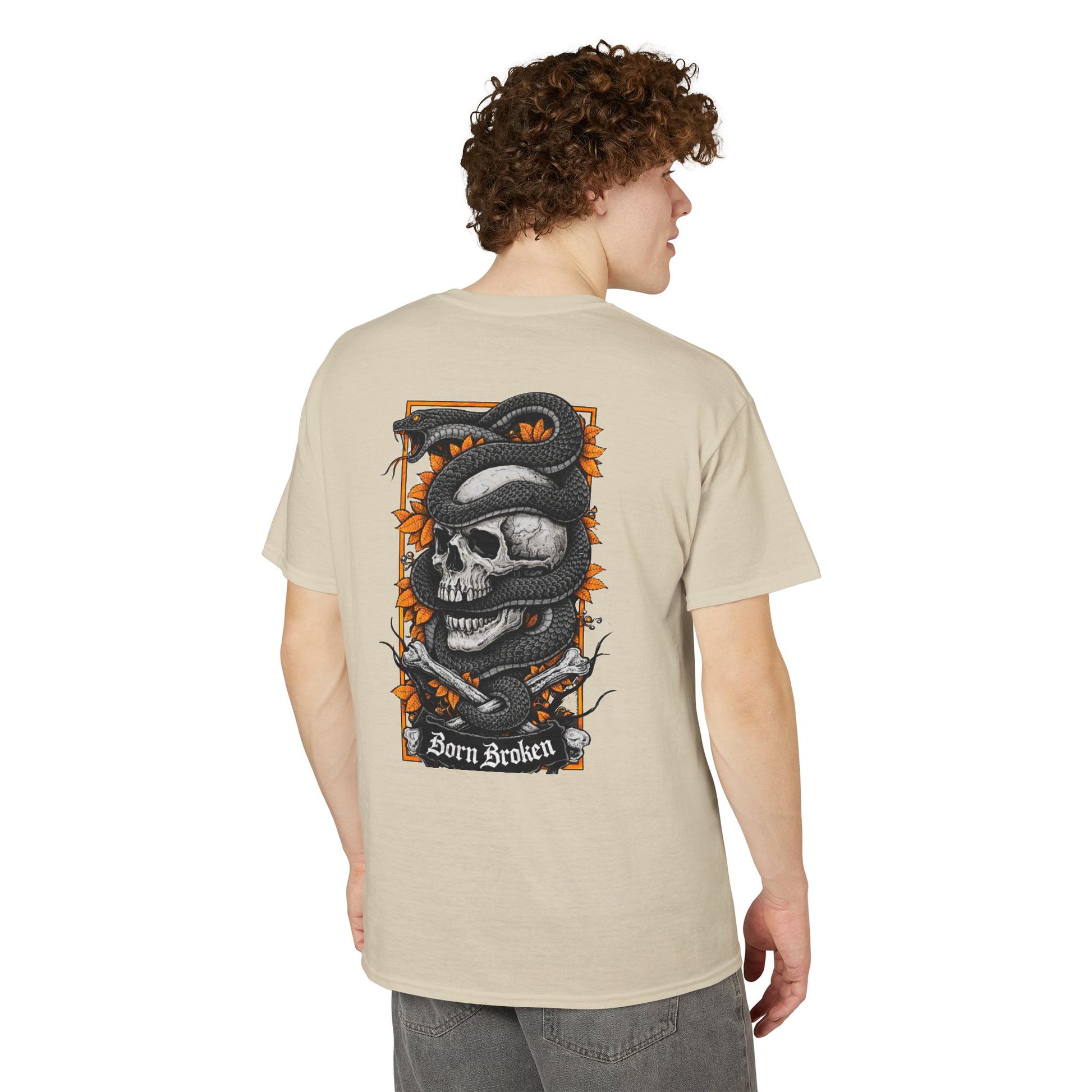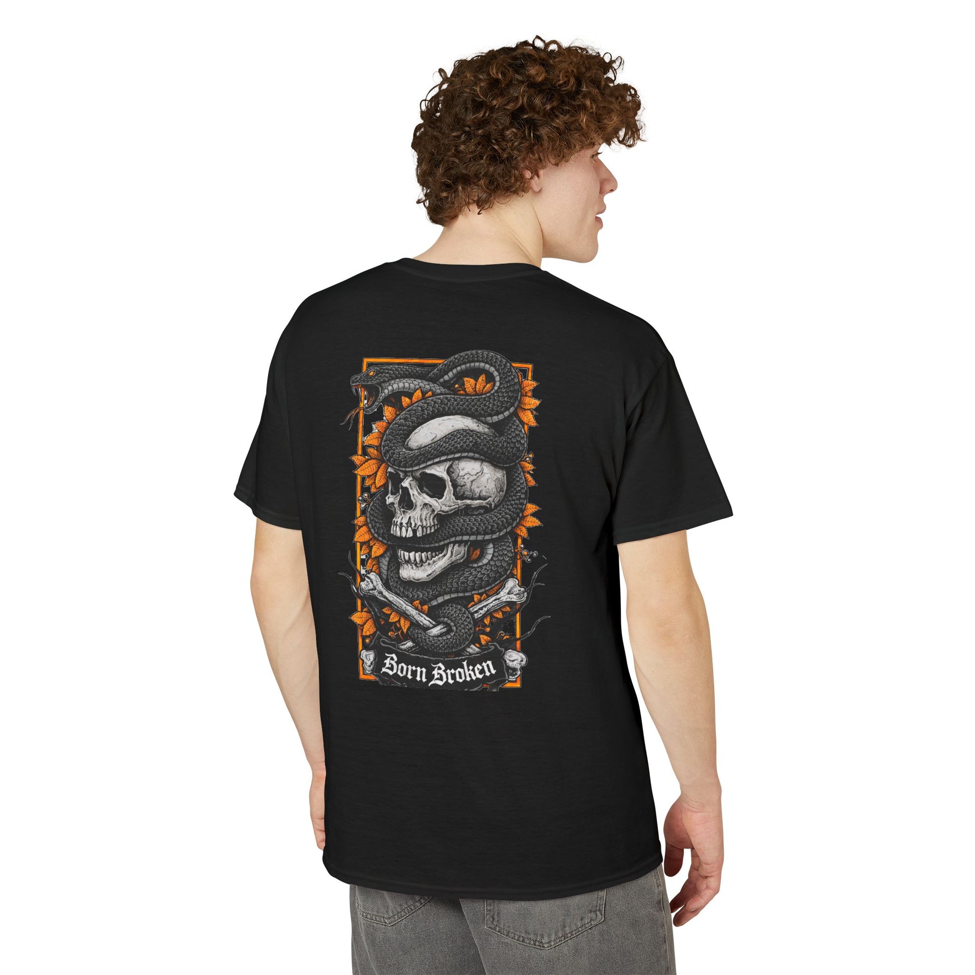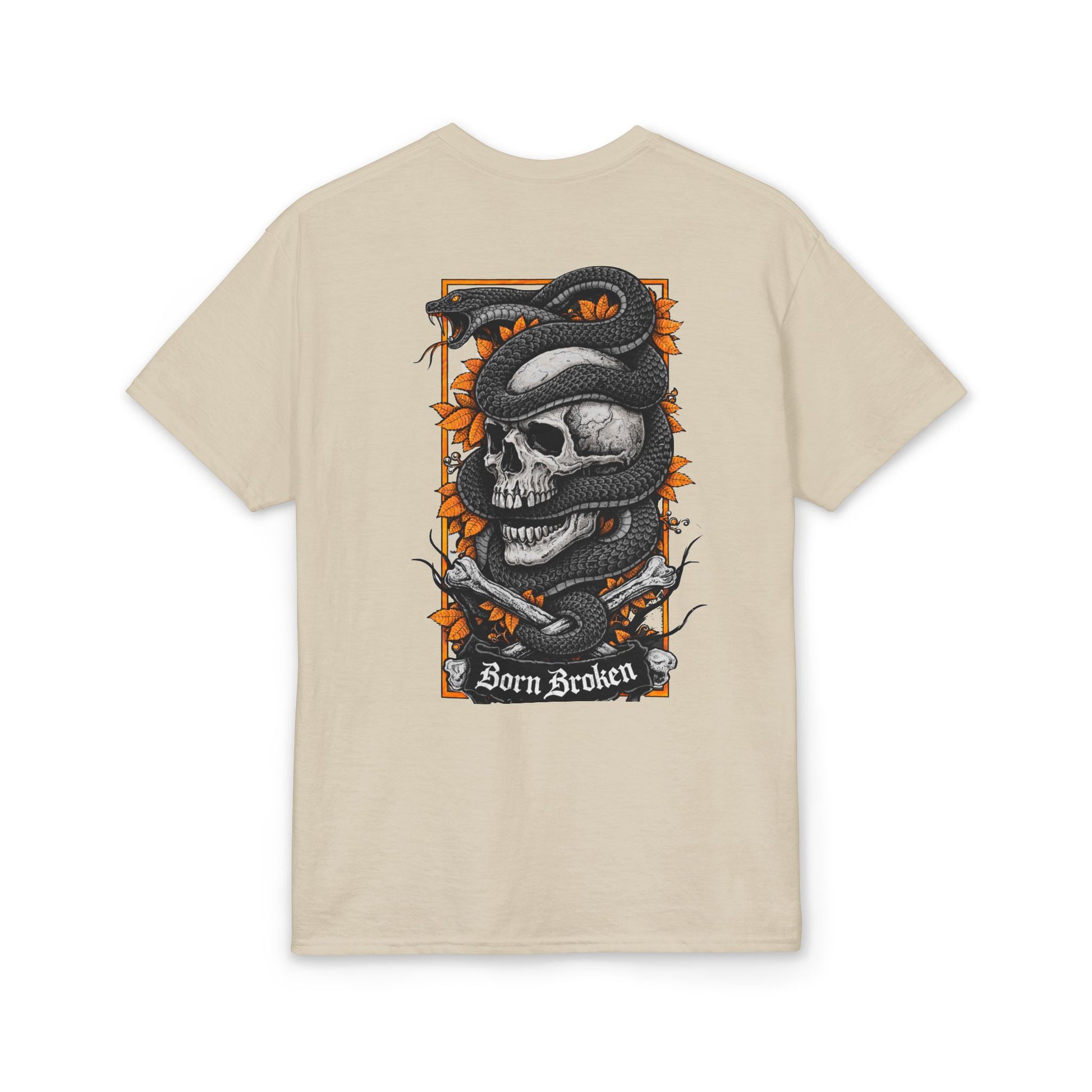 A bold, street-ready tee that carries a dark, expressive mood. The small chest emblem and large back art feature a weathered skull wrapped in a coiling snake, framed by jagged orange foliage and thorned branches. The words “Born Broken” sit beneath the main panel, giving the design a gritty, honest edge. It feels like a piece of wearable art for people who lean into darker aesthetics—perfect for late-night gigs, motorcycle runs, or layering under a leather jacket. The fabric breathes and pulls sweat away, keeping the silhouette crisp so the detailed print reads clearly from a distance. Wear it to show an unapologetic sense of self, or to add contrast to softer wardrobe pieces.