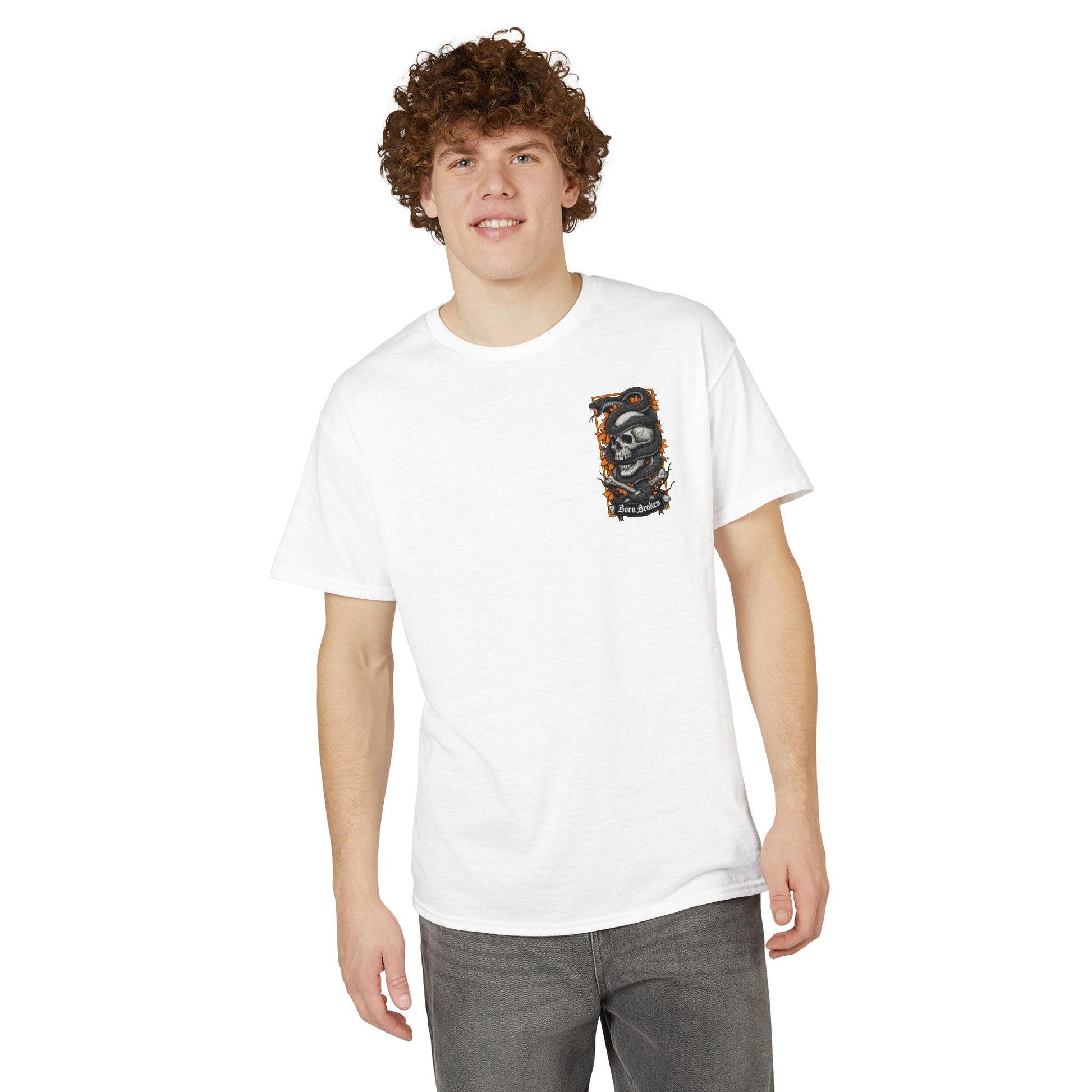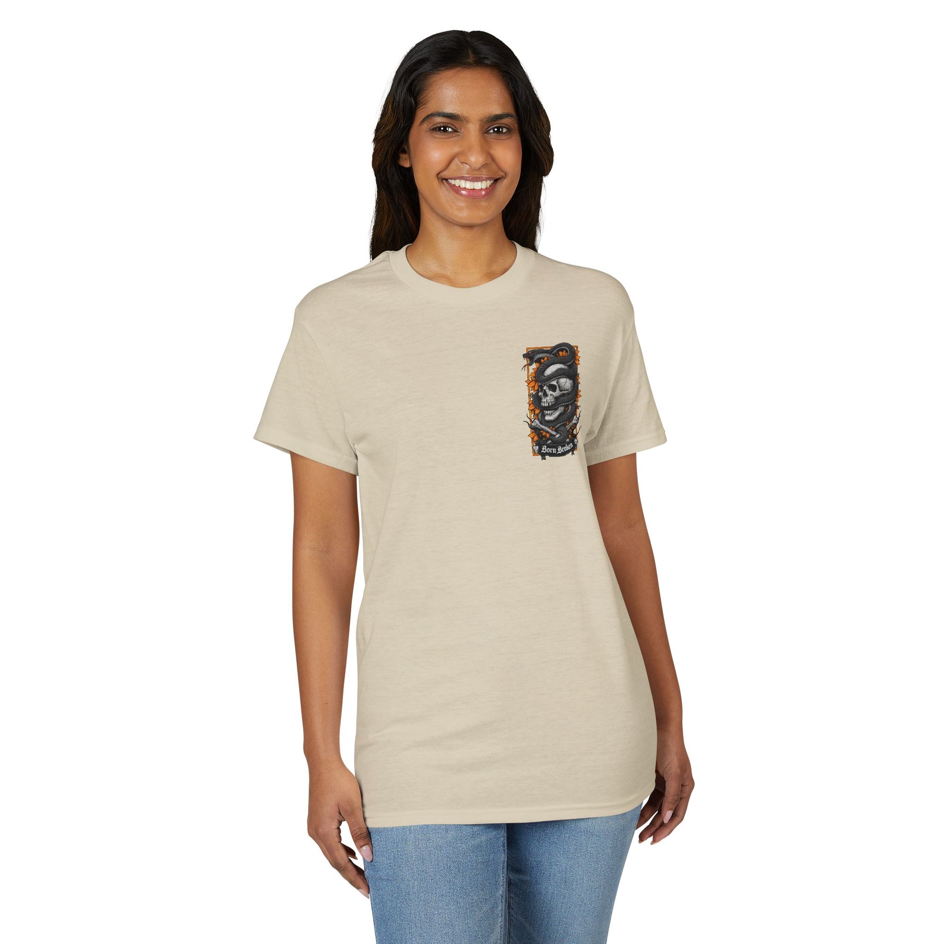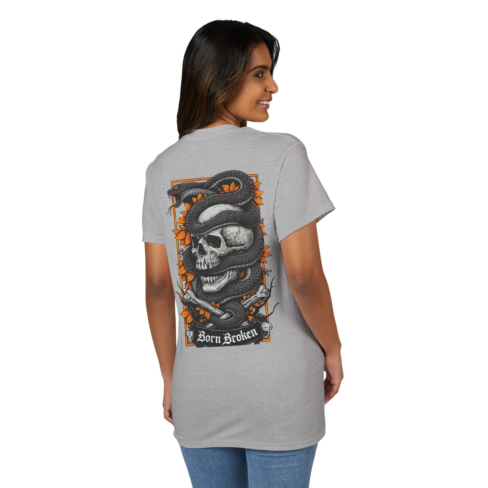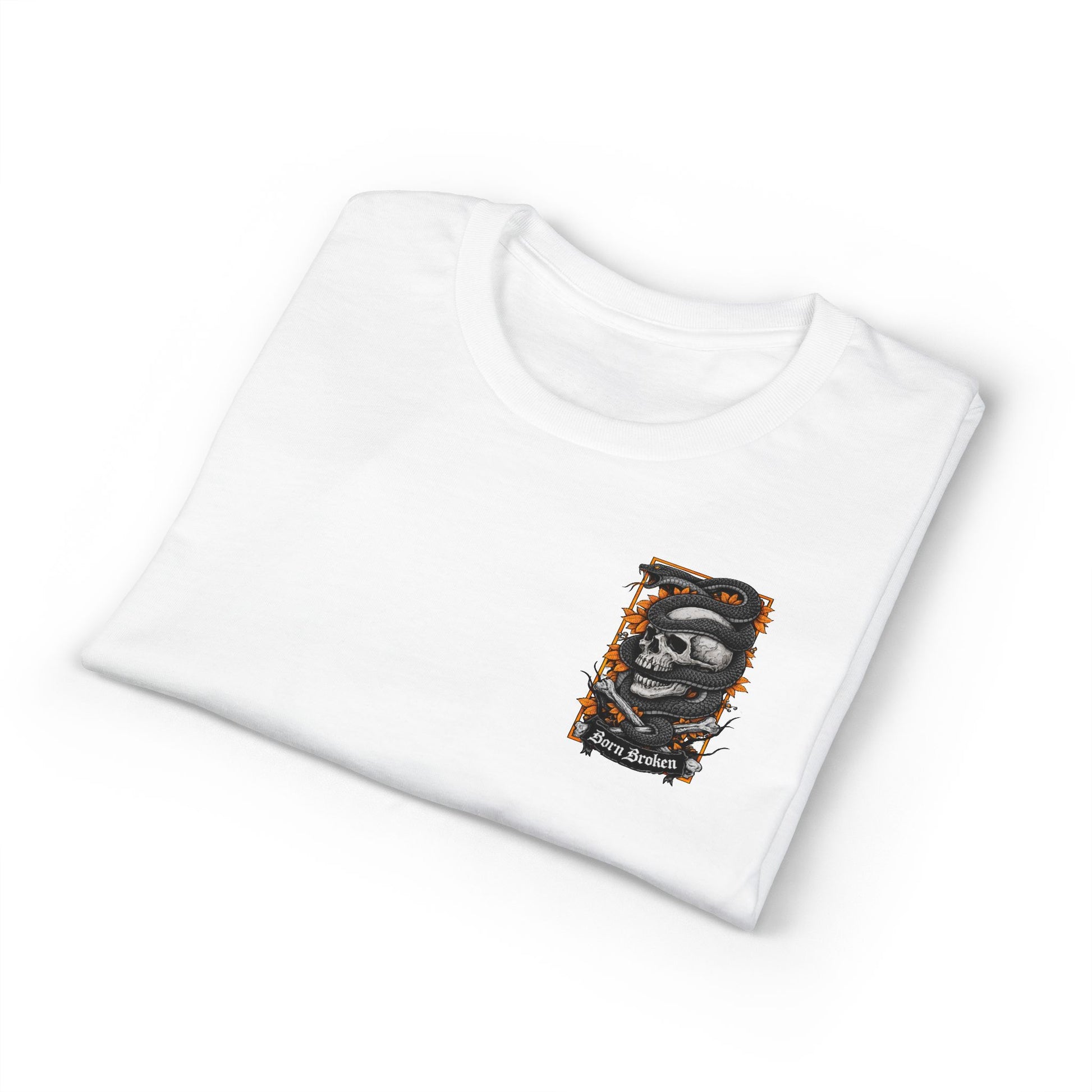 A bold, street-ready tee that carries a dark, expressive mood. The small chest emblem and large back art feature a weathered skull wrapped in a coiling snake, framed by jagged orange foliage and thorned branches. The words “Born Broken” sit beneath the main panel, giving the design a gritty, honest edge. It feels like a piece of wearable art for people who lean into darker aesthetics—perfect for late-night gigs, motorcycle runs, or layering under a leather jacket. The fabric breathes and pulls sweat away, keeping the silhouette crisp so the detailed print reads clearly from a distance. Wear it to show an unapologetic sense of self, or to add contrast to softer wardrobe pieces.